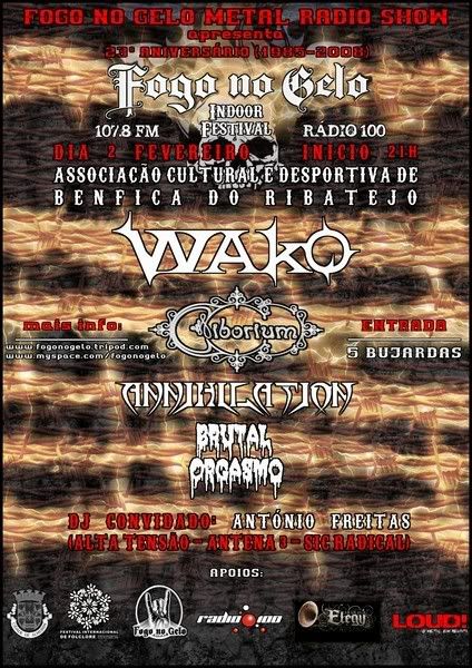 As bandas no alinhamento deste cartaz são os WAKO (Thrash/Death Core de Almeirim), CIBORIUM (Black/Death Metal de Benfica Do Ribatejo), ANNIHILATION (Death Metal de Almeirim) e BRUTAL ORGASMO (Grind Core/Death Gore de Tomar). O espectáculo terá inicio pelas 21H0 e o DJ convidado para este evento é o António Freitas. O Fogo no Gelo está de Parabéns pelo seu aniversário e, que o programa se prolongue por muitos mais anos! As bandas são todas ribatejanas, algo que por aqui começa a escassear, pelo menos a nível de Heavy Metal....