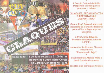 As Claques são uma parte do fenómeno desportivo integram o espectáculo com luz ,cor ,canticos como as tribos primitvas apelam ao combate e estimulam o sentido gragário de pertença a uma comunidade ou um clube tambem veiculam muitas vezes comportamentos anti-desportivos e violentos mas no conjunto enriquecem o jogo e o espectáculo. No Ambito dessa discussão, realizou-se no passado dia 15 de janeiro no Pavilhão Mário Cerejo um debate com o tema "Claques, Pró ou contra o espectáculo Desportivo?" que contou com o Prof.jorge Silvério, Provedor do Adepto, o Internacional Jorge Andrade, os Jornalistas Afonso Melo e José Gabriel Quaresma, e membros das claques nacionais, incluido os Piranhas do Tejo. Fica aqui um resumo em video desse evento.